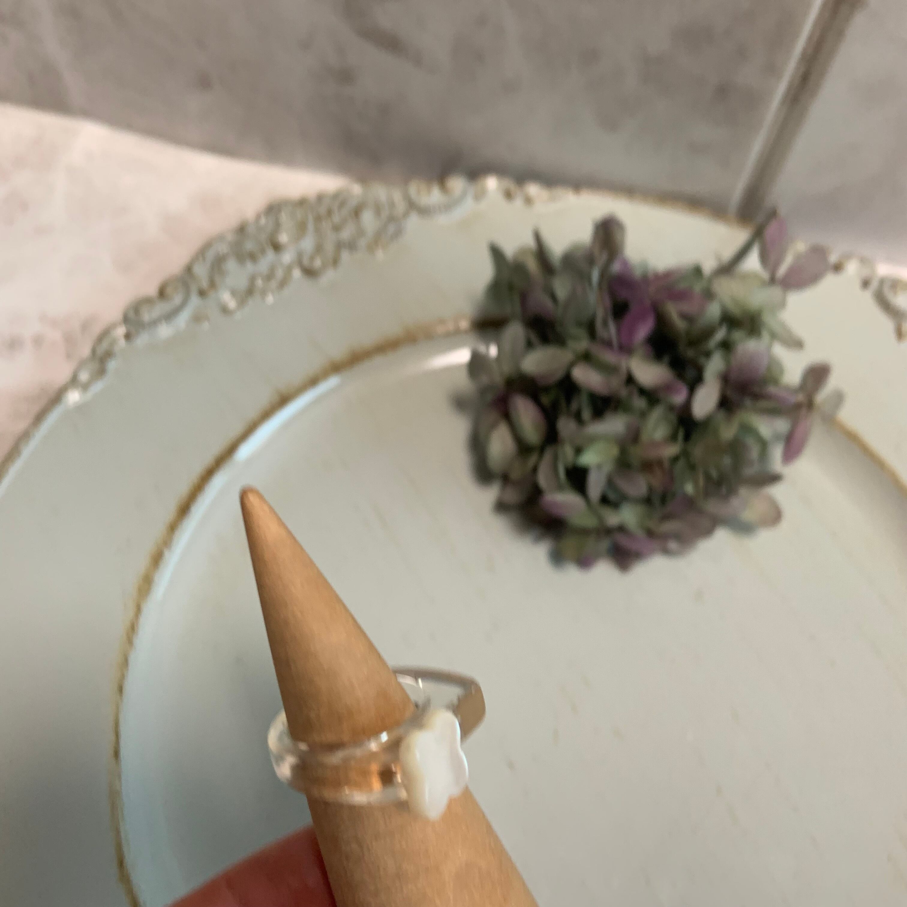 花の形のマザーオブパールを使用したシンプルデザインの『マザーオブパール/クリアリング』。モダンでスタイリッシュなデザインが魅力です。ピアスやイヤリングなどイヤーアクセサリーとセットアップコーデにできるアイテムとして、幅広い年齢層にご愛用いただいています。