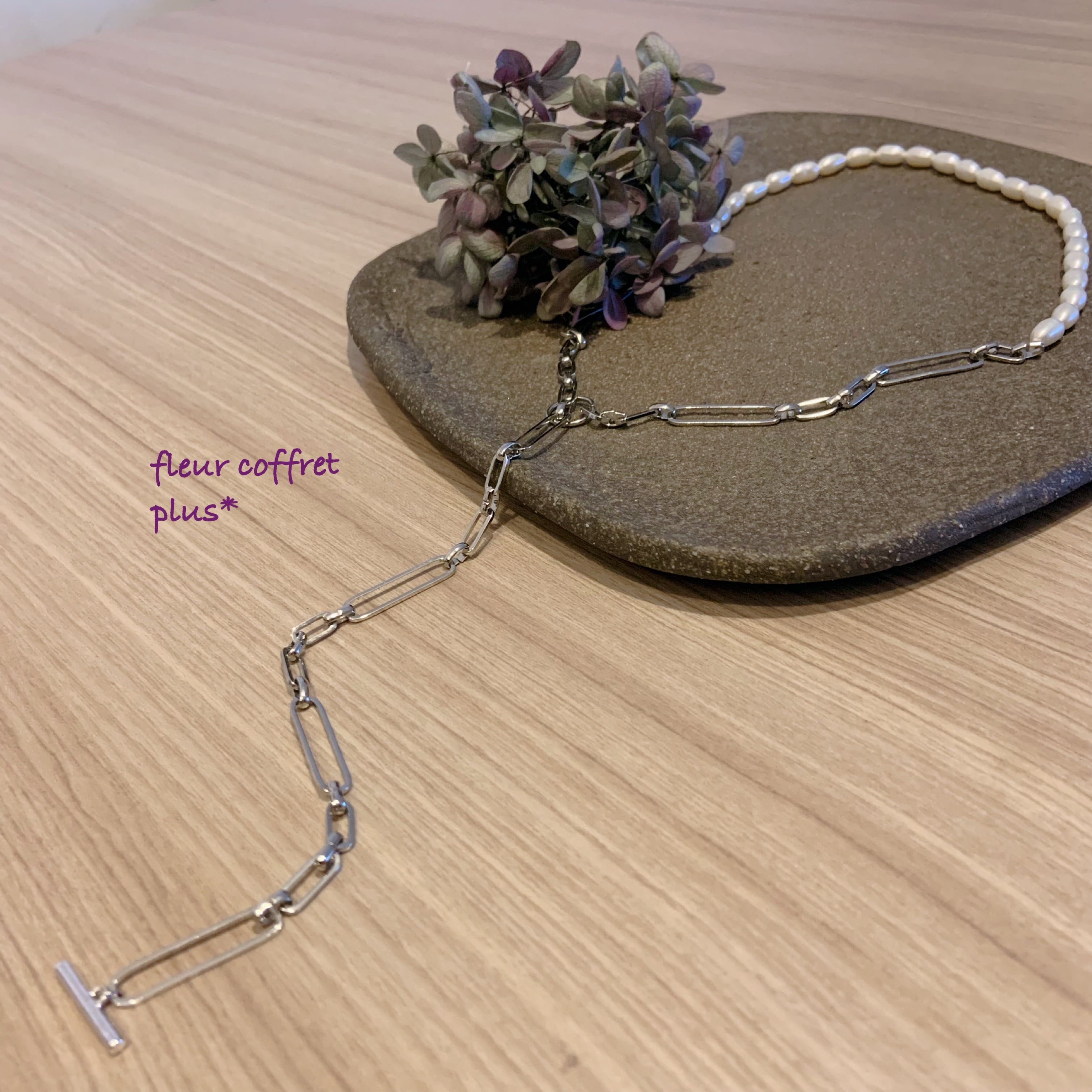 淡水パールを使ったシルバーチェーンとコンビのロングネックレスです。